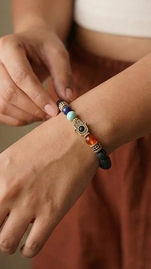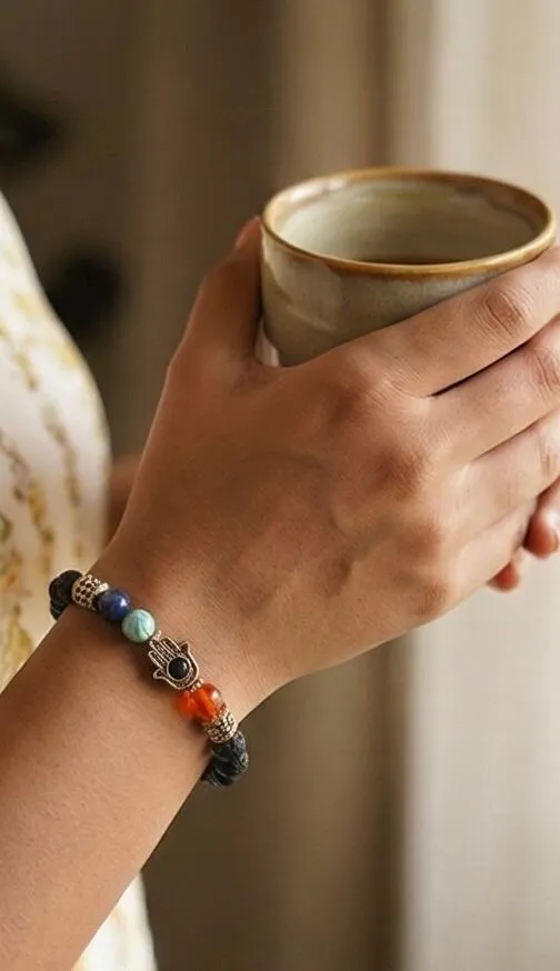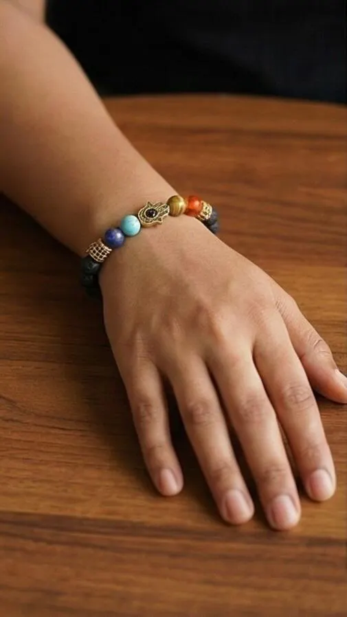- Materials: Lava Stone, 7 Chakra Gemstones, Hamsa Charm, Evil Eye Charm